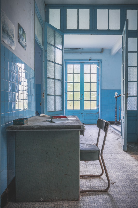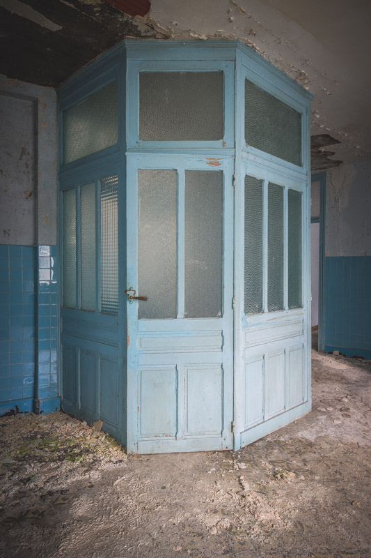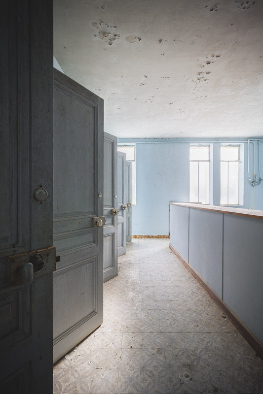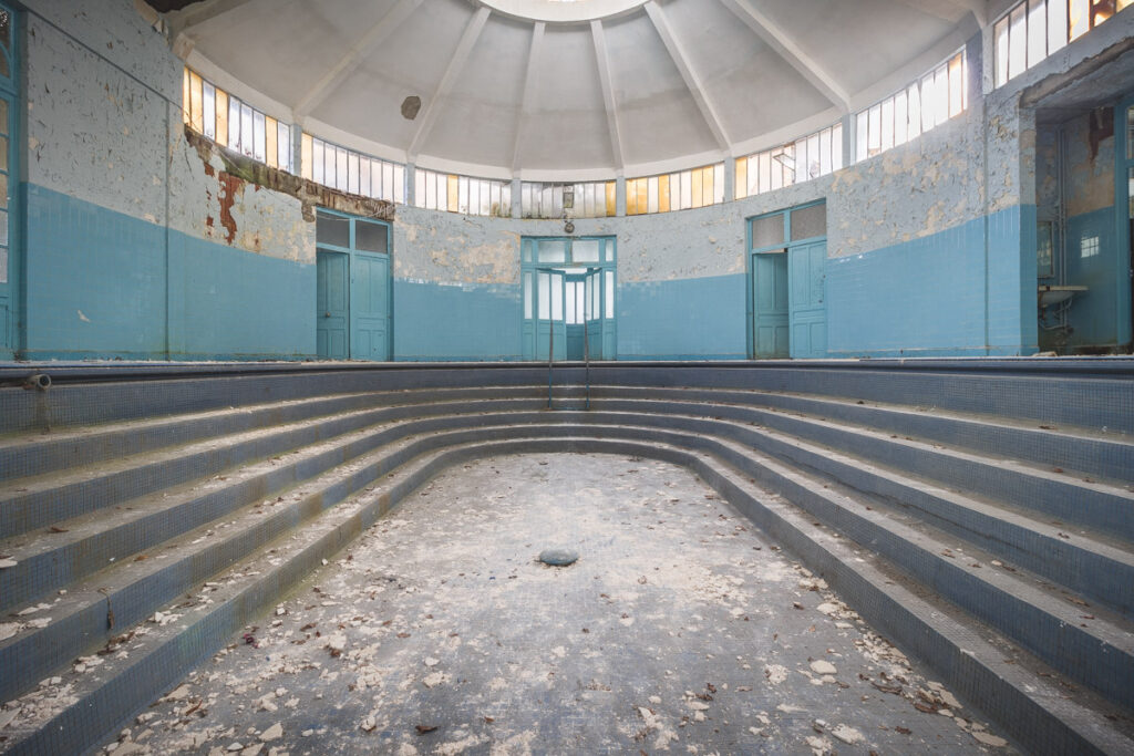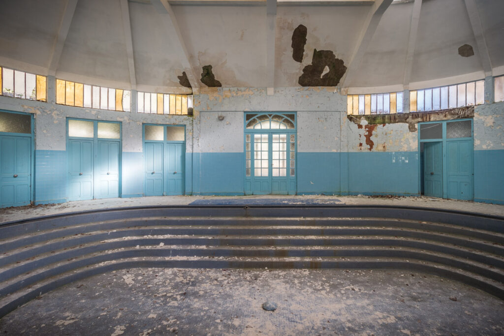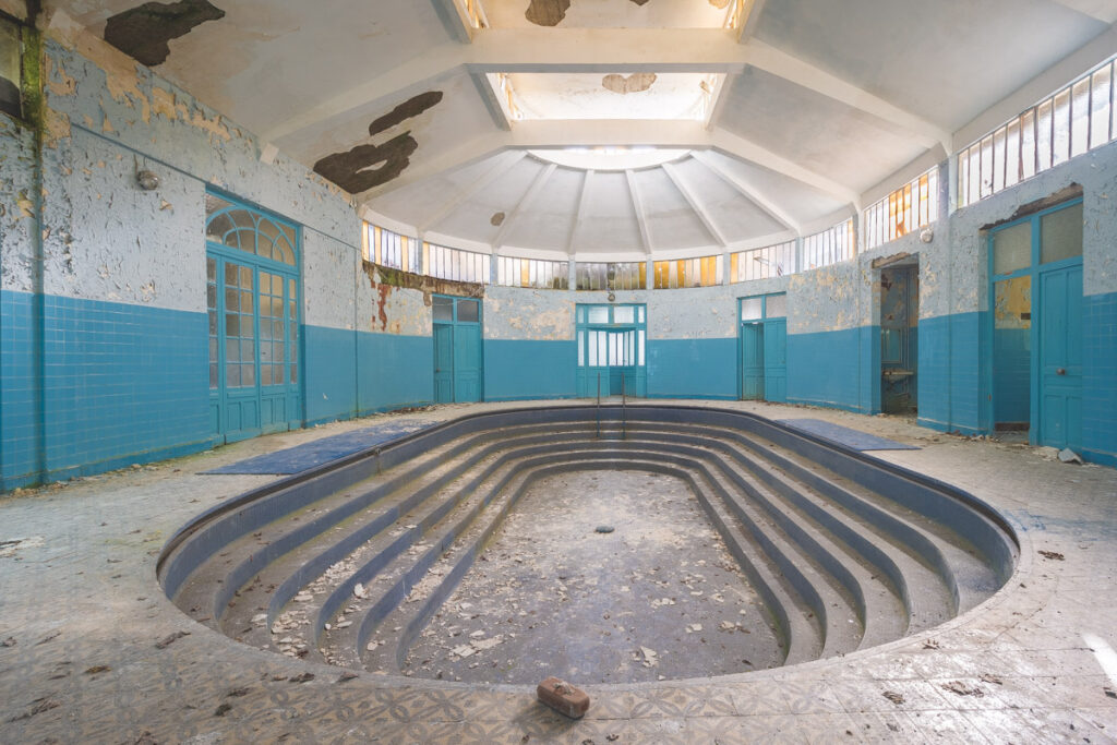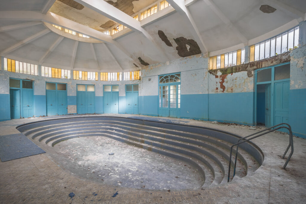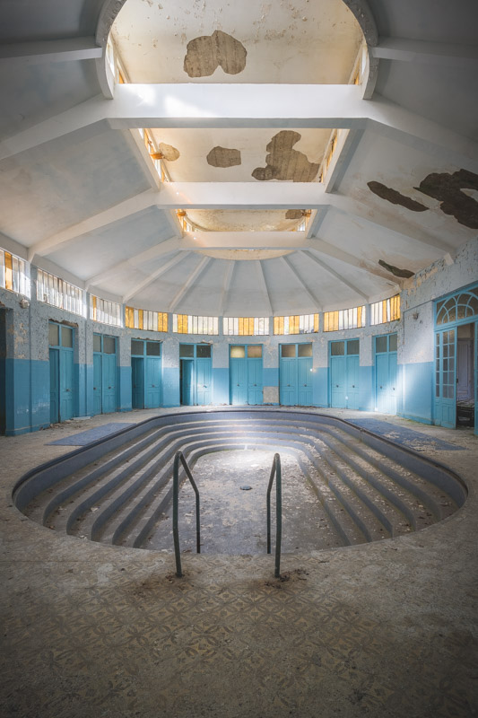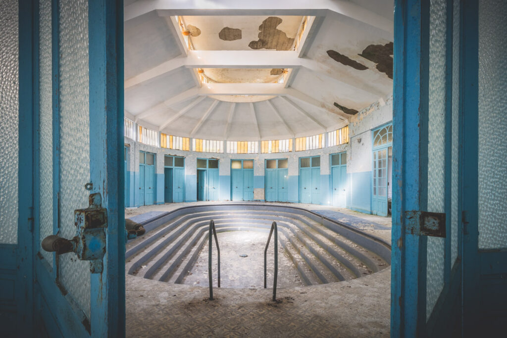 Une demi-heure plus tard, je suis enfin en train d’immortaliser ce splendide bassin. Quel plaisir d’être là ! Le brouillard matinal se lève laissant passer quelques timides rayons de soleil à travers les vitres jaunies des thermes bleus. Pas un bruit, juste le chant des oiseaux en fond sonore. Chacun agit de son côté, j’ai l’impression d’être seul dans le complexe. Tout est demeuré intact depuis des années, les anciennes salles de soin, les bureaux des docteurs, les baignoires. J’adore cette ambiance, où le temps a commis ses outrages sans que l’homme ne l’aide. Ces thermes connus depuis les romains accueillaient au XVIe siècle, les dames de la cour en quête de rajeunissement. Dans les années 60, l’activité battait son plein dans une station réputée pour apaiser les problèmes de peau. Les années 80 ont été témoins de leur fermeture suite à un incendie.
