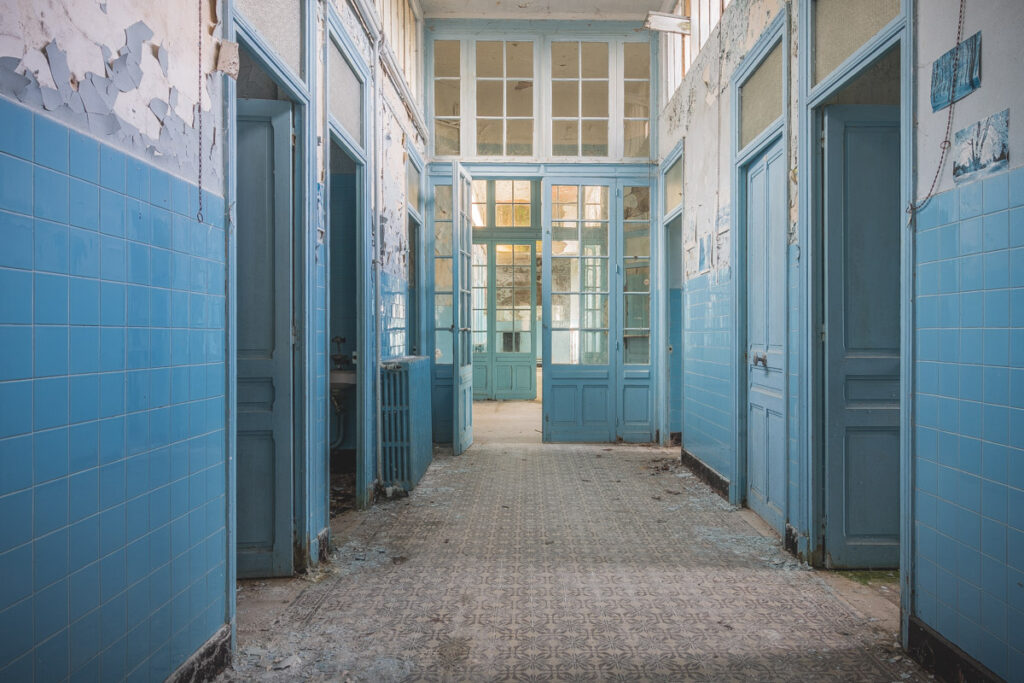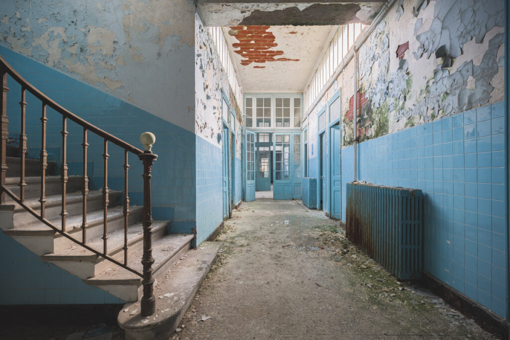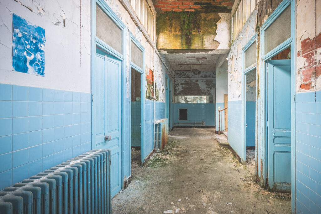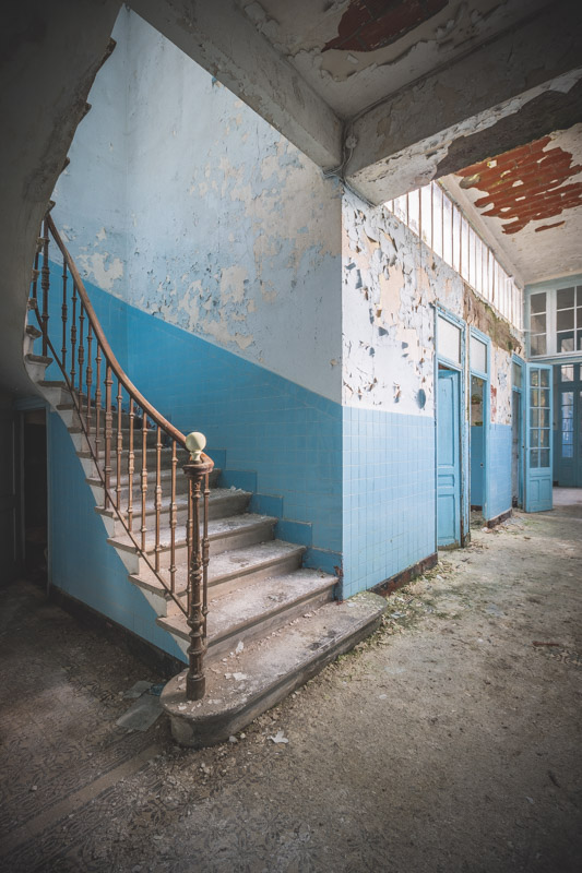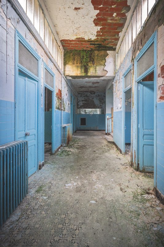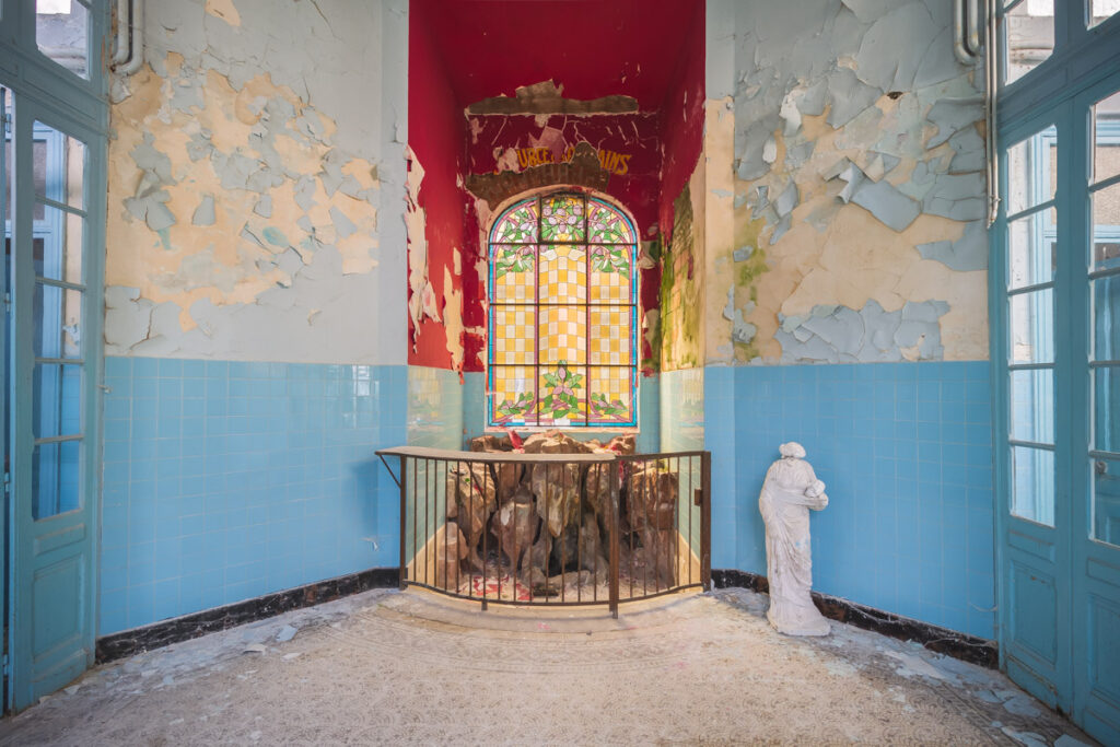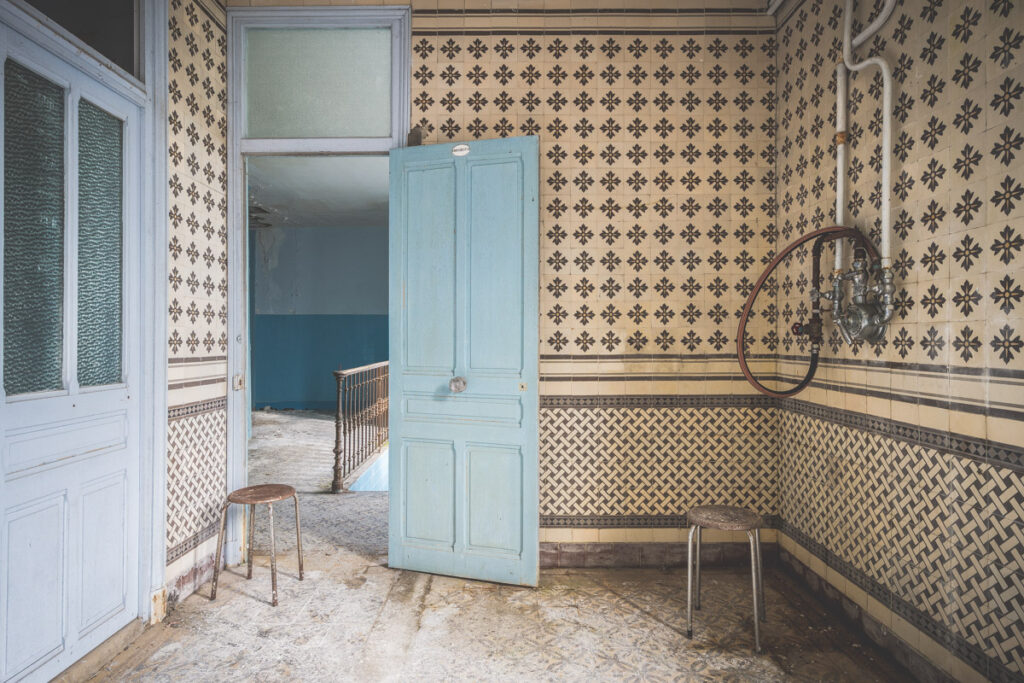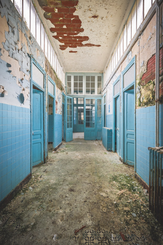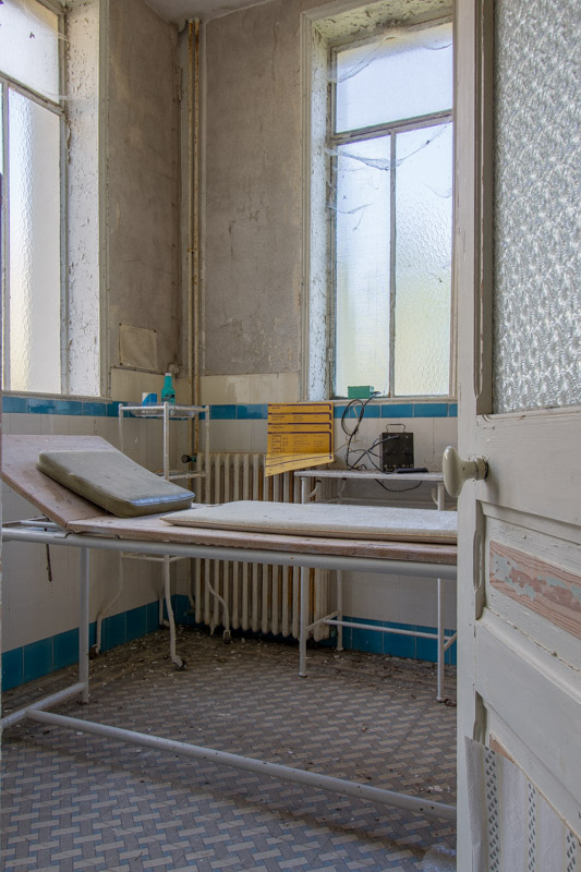 Une demi-heure plus tard, je suis enfin en train d’immortaliser ce splendide bassin. Quel plaisir d’être là ! Le brouillard matinal se lève laissant passer quelques timides rayons de soleil à travers les vitres jaunies des thermes bleus. Pas un bruit, juste le chant des oiseaux en fond sonore. Chacun agit de son côté, j’ai l’impression d’être seul dans le complexe. Tout est demeuré intact depuis des années, les anciennes salles de soin, les bureaux des docteurs, les baignoires. J’adore cette ambiance, où le temps a commis ses outrages sans que l’homme ne l’aide. Ces thermes connus depuis les romains accueillaient au XVIe siècle, les dames de la cour en quête de rajeunissement. Dans les années 60, l’activité battait son plein dans une station réputée pour apaiser les problèmes de peau. Les années 80 ont été témoins de leur fermeture suite à un incendie.