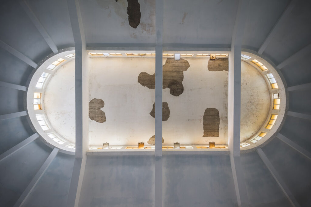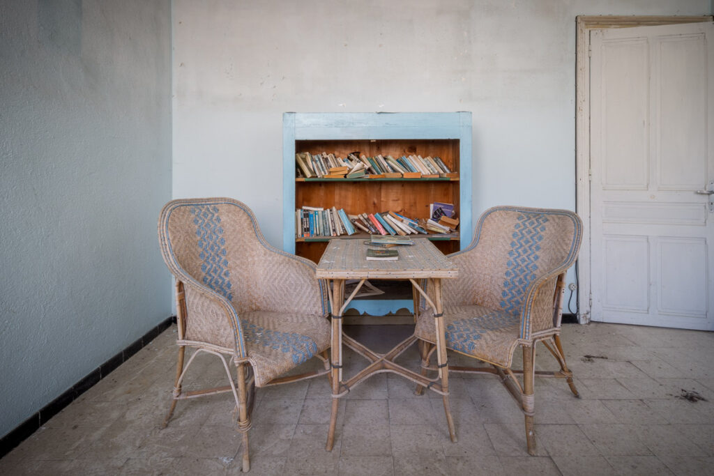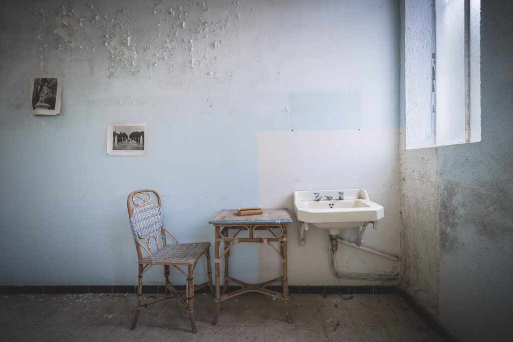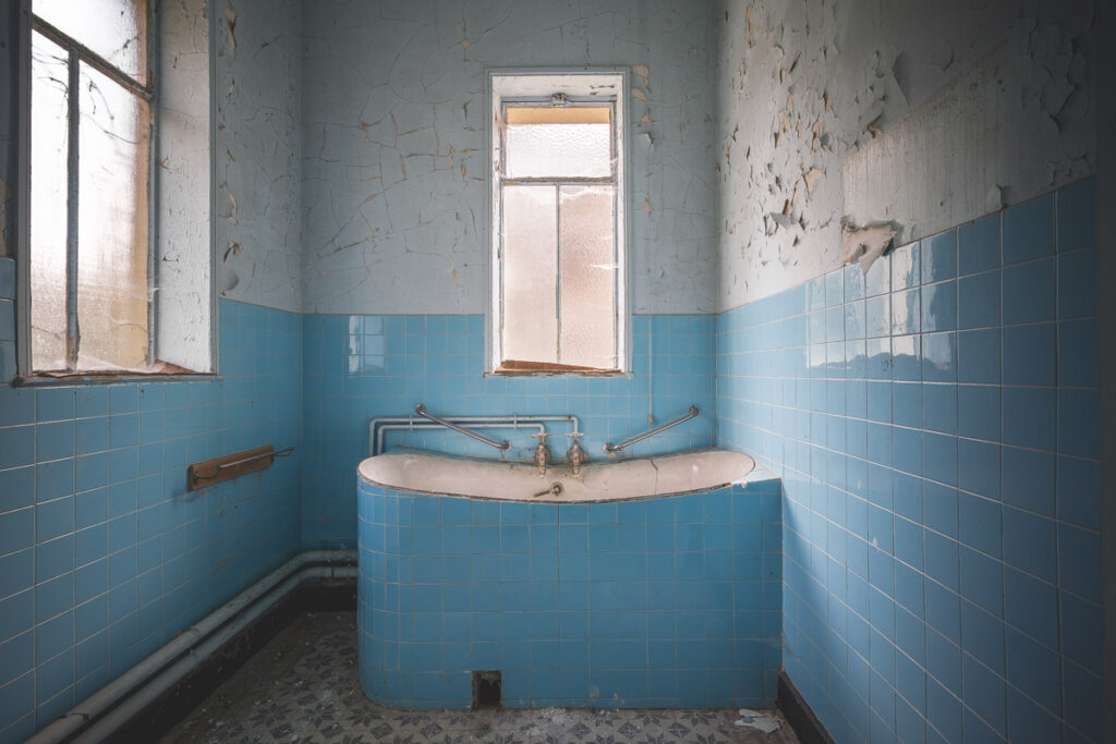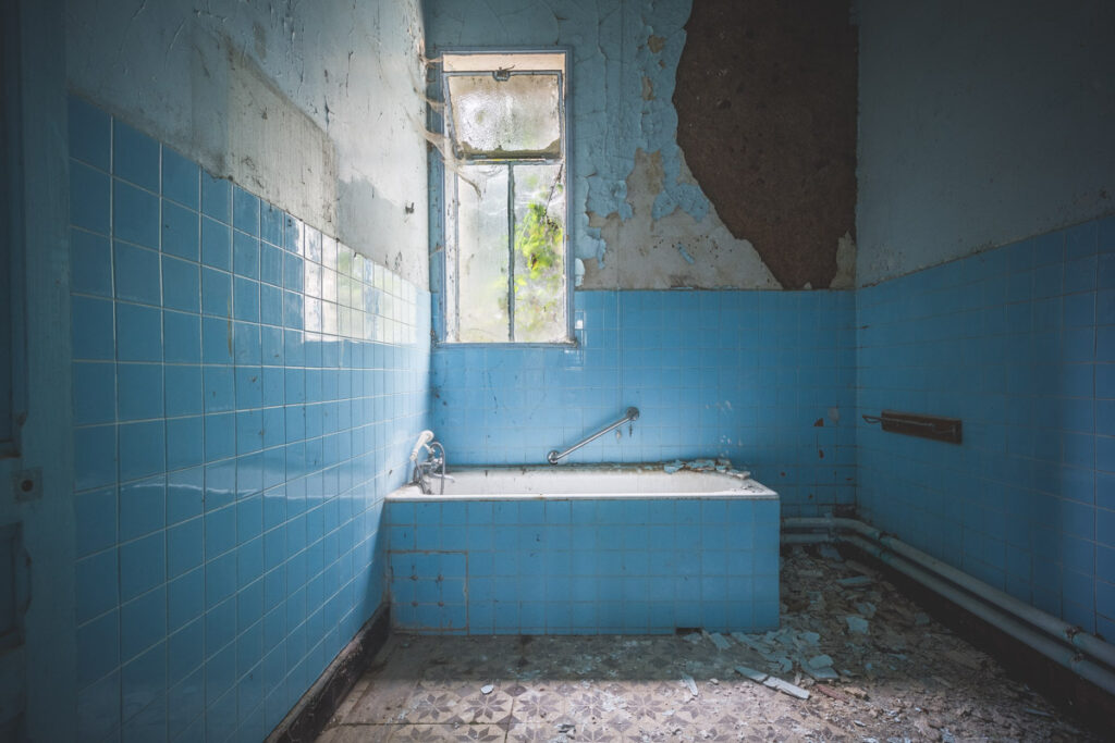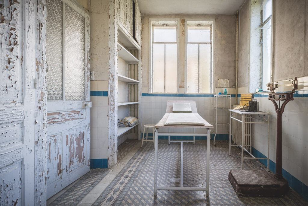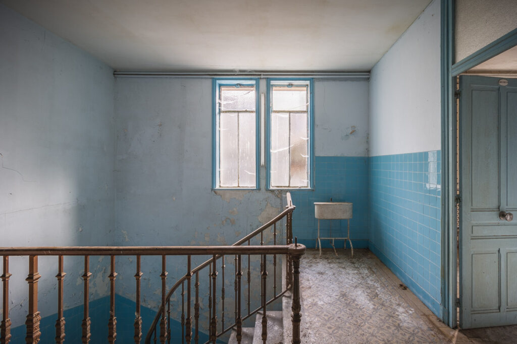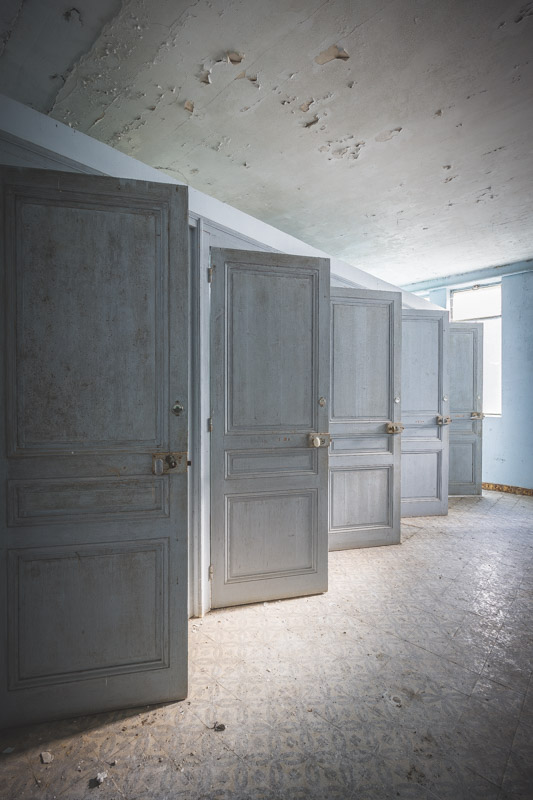 Une demi-heure plus tard, je suis enfin en train d’immortaliser ce splendide bassin. Quel plaisir d’être là ! Le brouillard matinal se lève laissant passer quelques timides rayons de soleil à travers les vitres jaunies des thermes bleus. Pas un bruit, juste le chant des oiseaux en fond sonore. Chacun agit de son côté, j’ai l’impression d’être seul dans le complexe. Tout est demeuré intact depuis des années, les anciennes salles de soin, les bureaux des docteurs, les baignoires. J’adore cette ambiance, où le temps a commis ses outrages sans que l’homme ne l’aide. Ces thermes connus depuis les romains accueillaient au XVIe siècle, les dames de la cour en quête de rajeunissement. Dans les années 60, l’activité battait son plein dans une station réputée pour apaiser les problèmes de peau. Les années 80 ont été témoins de leur fermeture suite à un incendie.